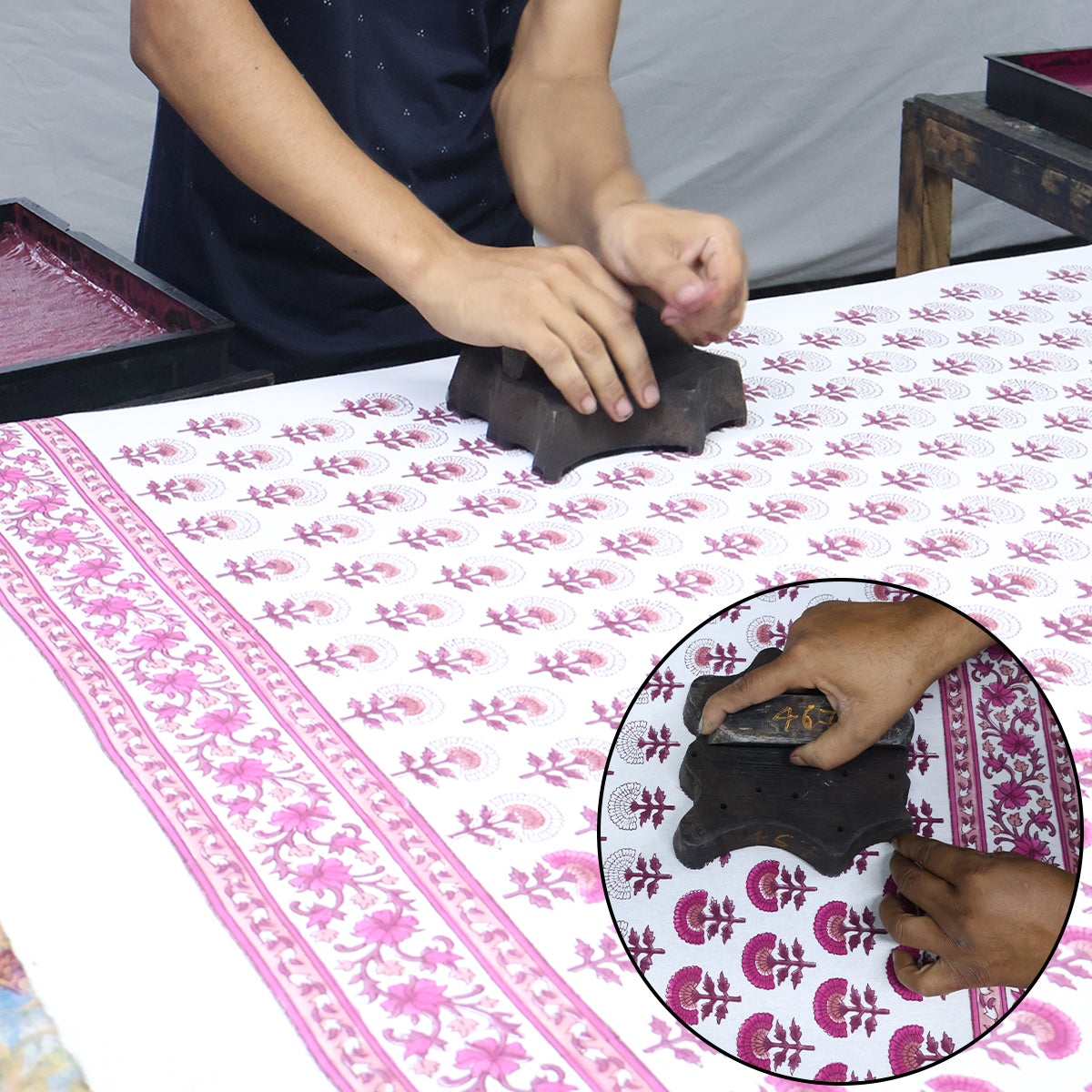 The process involves transferring the chosen image onto the wooden block; then, using sharp tools, workers carve away parts around raised areas that will hold onto fabric dye when stamped. Intricate details demand expert skill, and a finely carved block can be used over and over again for many years: this makes them valuable assets indeed within hand block printing workshops.